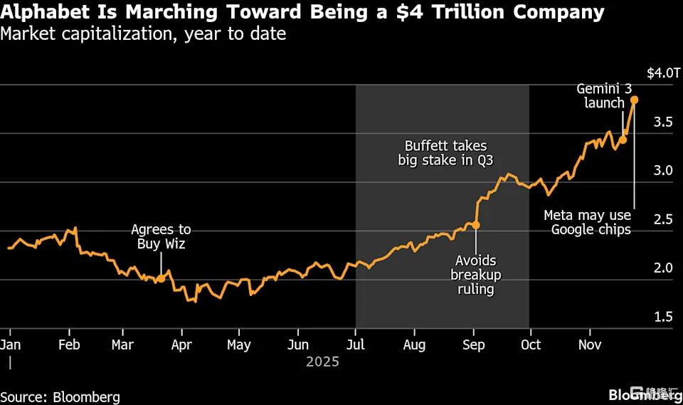 近期,谷歌凭借其新一代人工智能模型Gemini 3.0带来的突破性体验、Meta斥资数十亿美元购买谷歌TPU以及投资大师沃伦·巴菲特的重仓买入,引发了股价的连续大幅上涨。