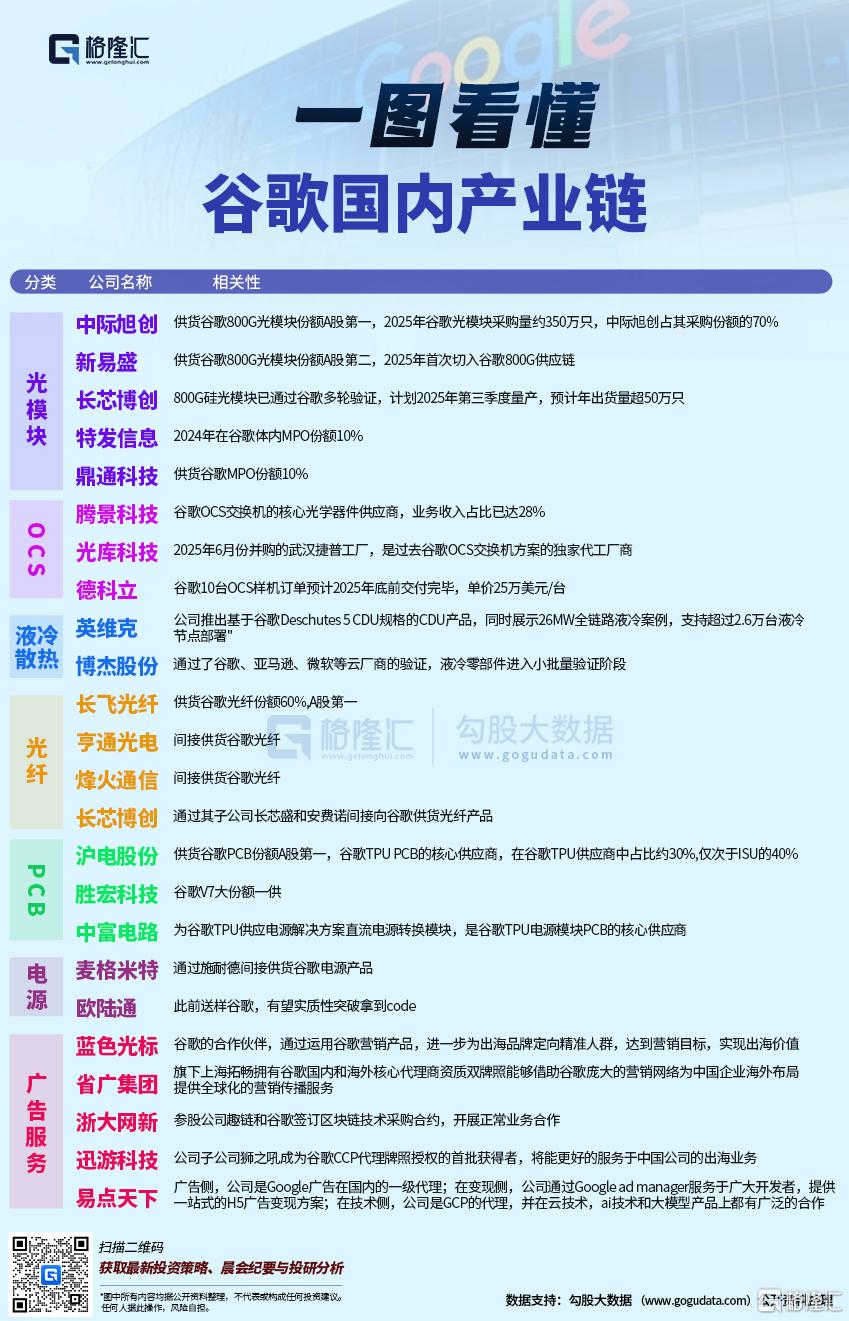 格隆汇研究团队梳理出谷歌产业链标的如下:
