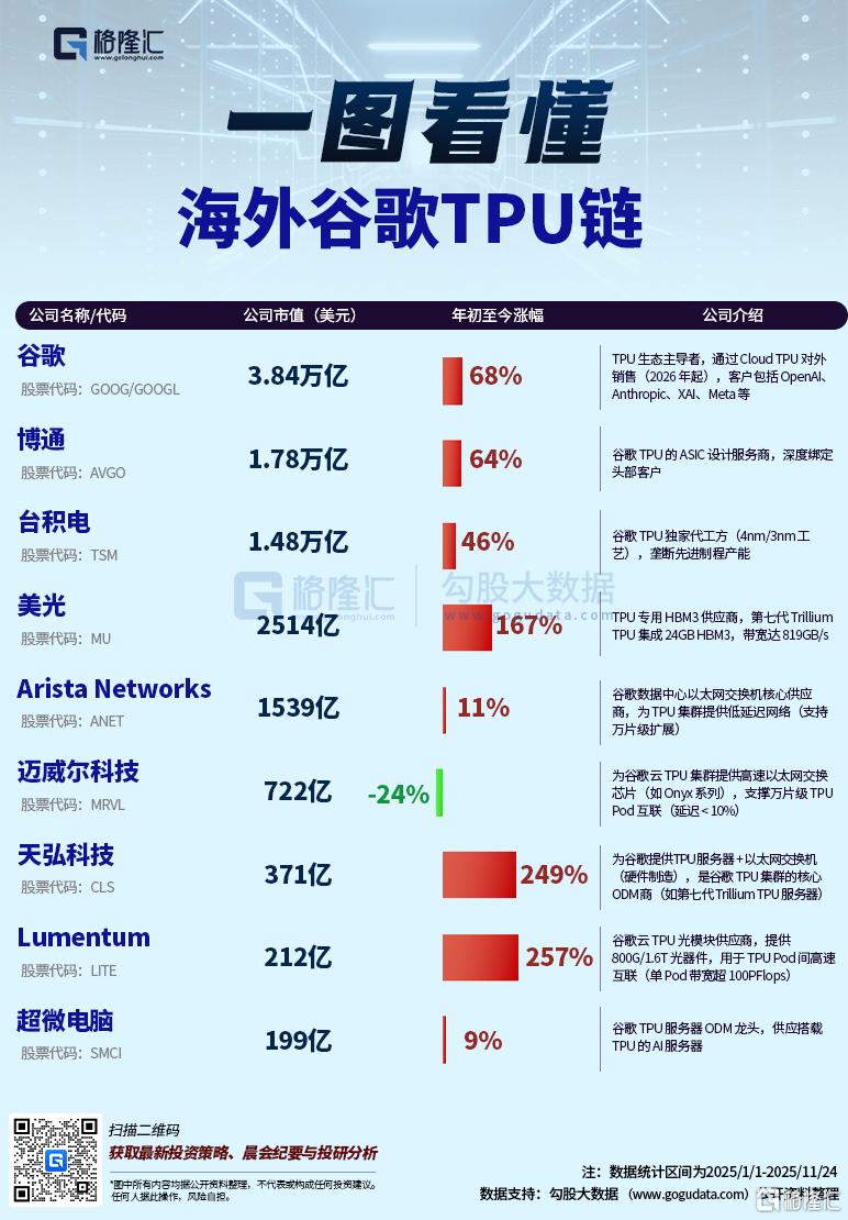 中泰证券研报指出,谷歌凭借从芯片(TPU)、网络(OCS)、模型(Gemini)到应用(云计算/搜索/广告等)的完整技术闭环,构建起强大的AI护城河,并推动资本开支持续增长。随着TPU出货量预期上修、OCS渗透率提升以及1.6T光模块放量,相关硬件供应商将迎来重大发展机遇。