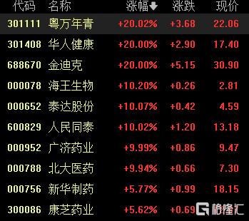 流感概念股继续活跃,粤万年青、华人健康、金迪克20cm涨停,海王生物、泰达股份、人民同泰、广济药业10cm涨停,新华制药、康芝药业跟涨。
