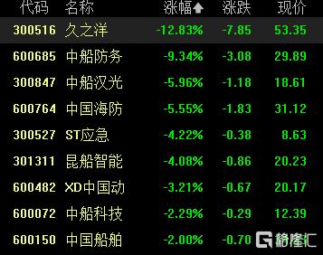 中船系大跌,久之洋跌超12%,中船防务跌超9%,中船汉光、中国海防跌超5%,昆船智能、中船科技等跟跌。