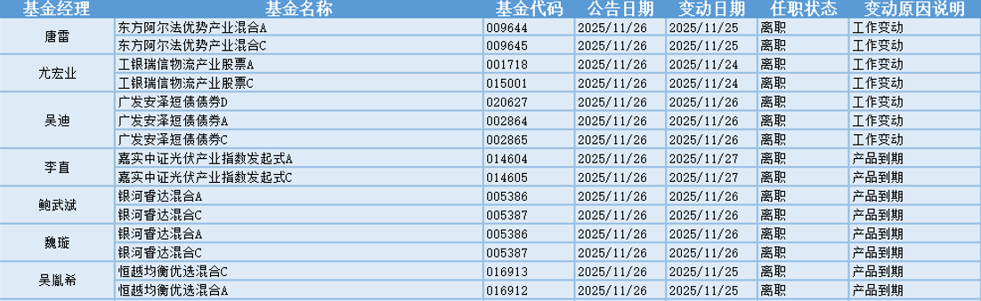 根据巨灵统计的数据显示,近30天(10.27-11.26)共有631只基金产品的基金经理发生离职变动。其中今天(11.26)有15只基金产品发布基金经理离职公告,从变动原因上来看,有3位基金经理是由于工作变动而从管理的7只基金产品中离职,有4位基金经理是由于产品到期而从管理的8只基金产品中离职。