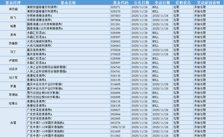 新基金经理上任方面,大成基金苏秉毅现任基金资产总规模为22.54亿元,管理过的基金多为债券型和混合型基金,任职期间回报最高的产品是大成景恒混合A(090019),为混合型基金,在任职的7年又155天时间内获得252.52%的回报,至今仍在管理该基金。新上任大成元瑞诚利债券A、大成元瑞诚利债券C这两只基金产品的基金经理。