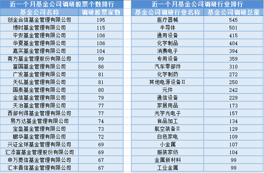 近一个月(10月27日-11月26日),创金合信基金参与公司调研的数量最多,共调研195家上市公司,然后调研较为活跃的还有博时基金、平安基金和华夏基金,分别调研115家、106家、106家上市公司;从调研行业上来看,基金公司对医疗器械行业的上市公司调研次数最多,共有545次,其次是半导体行业,基金公司调研了501次。