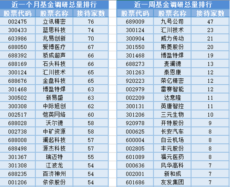 从个股调研情况上来看,最近1个月(10月27日-11月26日)最受公募基金关注的是立讯精密,属于消费电子行业,主营业务为从事消费电子、通信及数据中心、汽车、医疗等领域相关零组件、模组及系统集成业务。共有76家基金管理公司参与调研,其次是蓝思科技和兆易创新,分别接受74家、70家基金管理公司的调研。