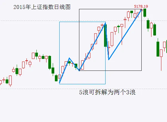 明确了这一点后,那么在实战中就可以去寻找各种3浪结构进行操作。例如沪指2015年5月8日起走出一波5浪结构,在走完前先是走了一波3浪,当发现日线8连阳并且出现“强弩之末”后,那么就可以先不管这波会走3浪还是5浪,判断接下来很可能会有个调整浪,短线可以考虑先减仓卖出再说。想运用波浪理论把整个一段趋势的浪型划分并且预判准确是一件很困难的事情,并且市场也很少会走出那种教科书般的清晰结构。因此因此索性只看局部,通过找3浪结构的方法去判断转折。当然判断转折的级别也是一个难点,但无论如何只要能捕捉到3浪结构的拐点,按最保守的策略做至少能吃到或多或少的一段。即如果走5浪结构,3浪后的调整幅度会小一些;而如果走的就是3浪结构,那么后面的调整就会更大一些。