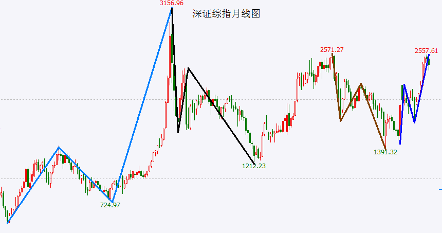 最近就有个很好的例子,即目前A股各指数就走出了跨年的3浪结构上涨(参见上文深证综指月线图),高点出现了吗?无论能涨多高,调整总会出现,未来的级别和空间多大?各位可以自行分析判断一下,数月后再进行验证……