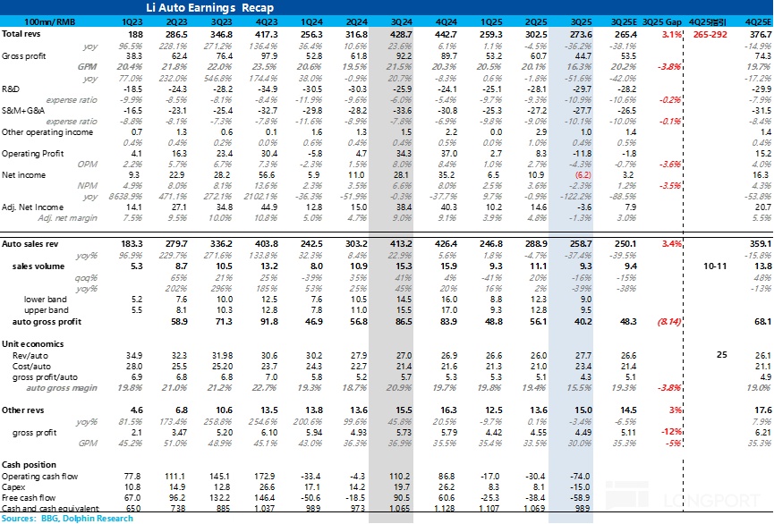 先从市场最关心的卖车业务来看,由于本季度有理想Mega召回事件对成本端的负面影响(预计召回成本11亿元),所以乍一看卖车毛利率“惨不忍睹”,环比大幅下滑3.8个百分点至16.3%。