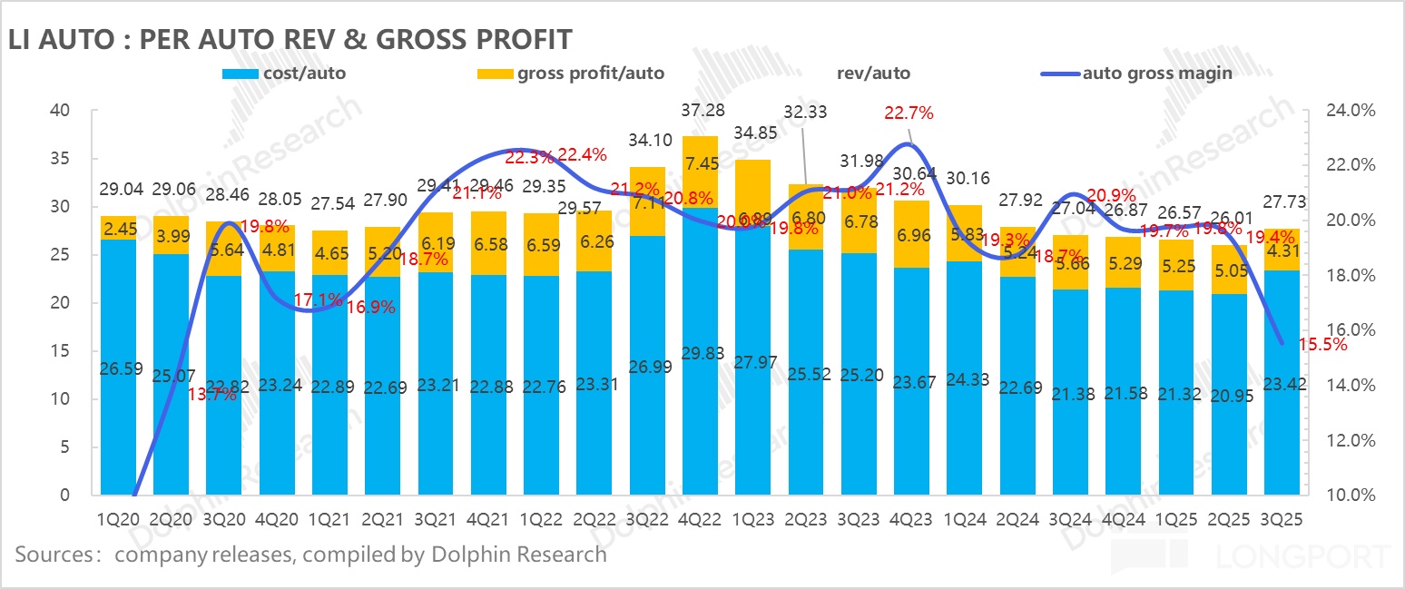 而四季度在销量不及预期(仅环比上行7%-18%),卖车单价继续下滑,L系列折扣力度继续加大,同时叠加i6“油比电低”的定价导致的实际毛利率可能比L6还要低的情况下,市场一定会担心四季度理想卖车毛利率端面临的压力,理想一直以来保持的20%上下的稳定卖车毛利率水平可能在四季度会面临失守的局面,具体要看电话会中管理层如何指引。