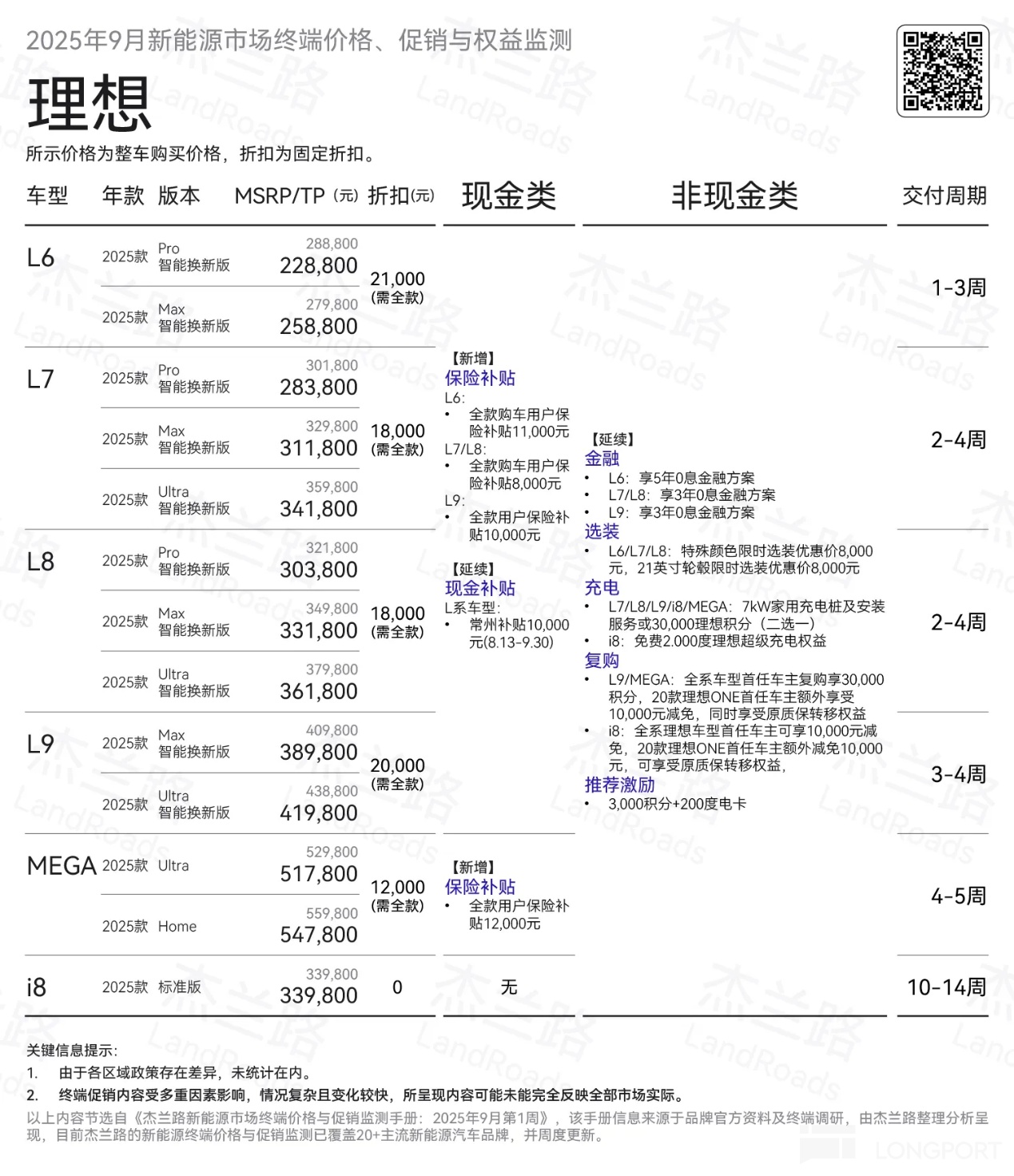 从折扣力度来看,理想一方面提供全款卖车折扣(L6/L9全款优惠2.1/2万元,L7/L8全款优惠2.8万元,Mega 1.2万元),整体折扣力度比二季度理想清老款L系列的折扣力度还要大,而另一方面理想也继续加大了针对L系列的保险补贴,但仍然抵挡不住L系列销量持续的势头。
