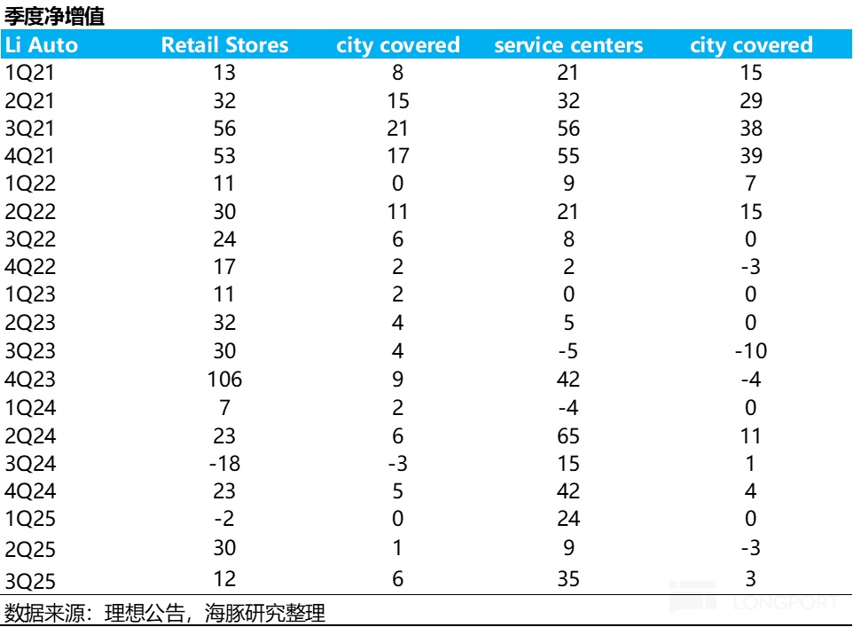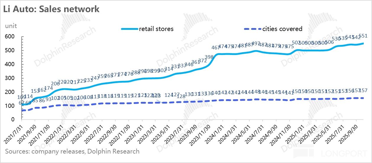 在渠道建设上,理想三季度继续加大渠道铺设,三季度新增了12家零售店和35家零售中心,也为了纯电车型的上量做准备,理想也在将优化门店布局,搬迁低效门店,平衡商场店和中心店比例,并通过“星辰计划”轻量化门店快速进入四五线市场,降低成本和周期,提高覆盖率。