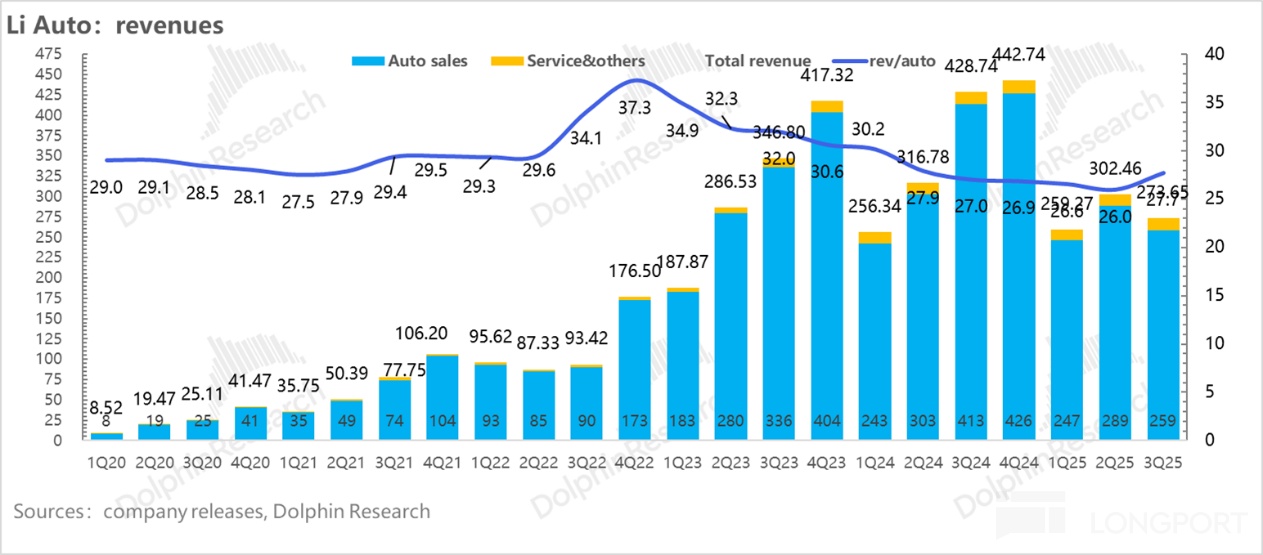 在销量已经公布的情况下,三季度理想总收入是274亿, 高出市场预期的265亿,但收入端再次录得同比-36%的负增长。
