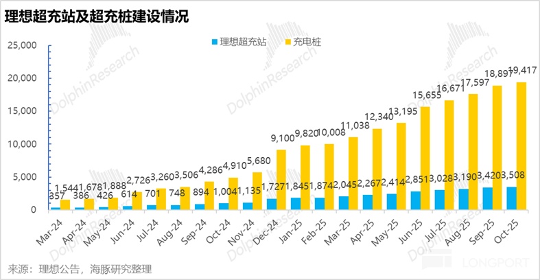 而本季度资本开支15亿,环比上季度上行7亿,一方面由于理想超充站的持续投入,另一方面预计由于AI带来的算力端的投入增加,在超充站建设方面,理想三季度新增569座超充站,而超充站数量已经达到了3508座,超充站铺设进度也基本和同行持平,同样在为理想纯电战略的上量做准备。