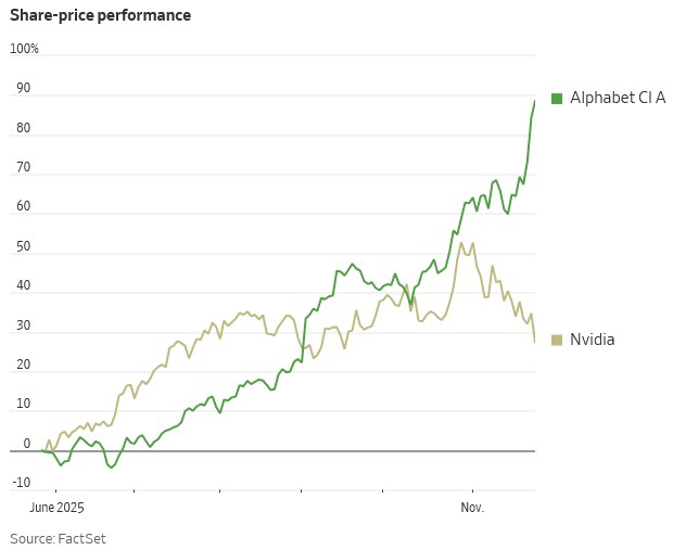 TradingKey - 近期,席卷市场的人工智能(AI)交易担忧,对英伟达(NVIDIA)构成了沉重打击。 这家公司原本是投资者对AI的象征,如今却成为市场回调的重灾区。与此同时,谷歌却逆势而行。凭借其 TPU 的关键进展,谷歌母公司 Alphabet 股价持续上涨,被投资者视为英伟达 GPU 为数不多的可替代方案之一。截至本月,Alphabet 涨幅达到 15%,而英伟达股价则下跌了 12%。