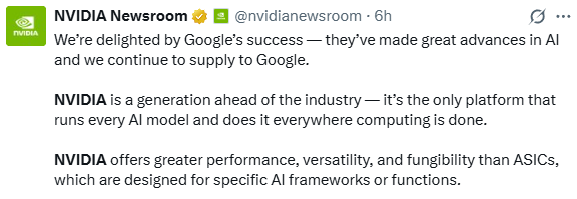 面对市场焦虑,英伟达选择出面回应。 周四,该公司通过 X 平台发布声明称:“我们为谷歌的成功感到高兴,并计划继续为这家科技巨头提供芯片。” 不过紧接着补充强调: