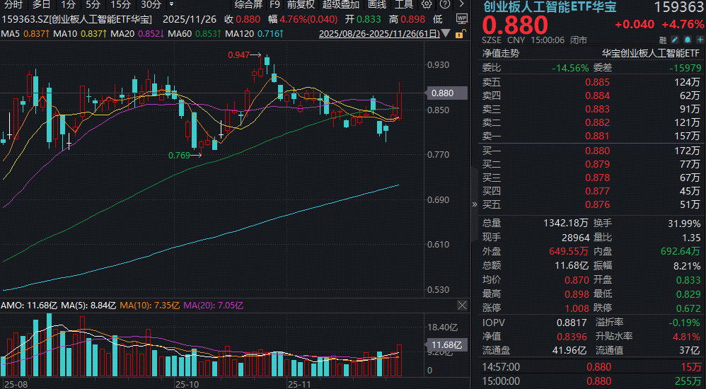 热门ETF方面,光模块CPO含量超54%创业板人工智能ETF(159363)表现强势,场内价格一度冲击7%,收盘仍大涨4.76%,表现优于科创AI、中证人工智能等同类主题ETF,一举收复所有均线,日线三连涨!交投显著放量,单日成交11.68亿元,资金交易情绪高涨