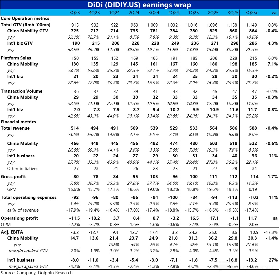 网约车龙头$滴滴出行(DIDIY.US) ,于 11 月 26 日晚美股盘前公布了 2025 年 3 季度的业绩。11 月初,滴滴在新的指引中,提示市场本季度国内业务的利润率会有所下滑,而海外则因巴西外卖投入、亏损会大幅扩大。随后滴滴股价回调了近 20%,大体消化了这个坏消息,实际业绩的表现则基本符合新指引。具体来看: