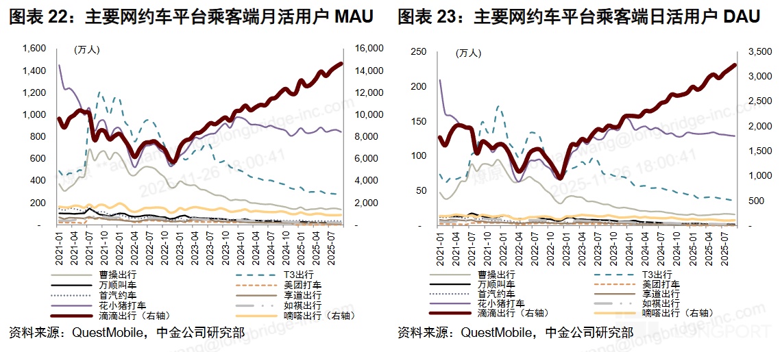 这点一方面从滴滴依然相对稳定的国内业务订单量和 GTV 增速,一方面从下图也可见,在各主要网约车平台中,滴滴的活跃用户数量是唯一持续走高的,而其他除高德外都在走低(高德因主体是地图也包含其他功能,并非完全是网约车用户)。可见用户在进一步向滴滴集中。且从近期的动态上,包括高德、美团等竞争对手显然也并没有精力和意图再加大网约车上的投入。
