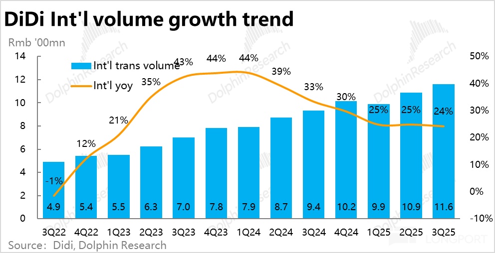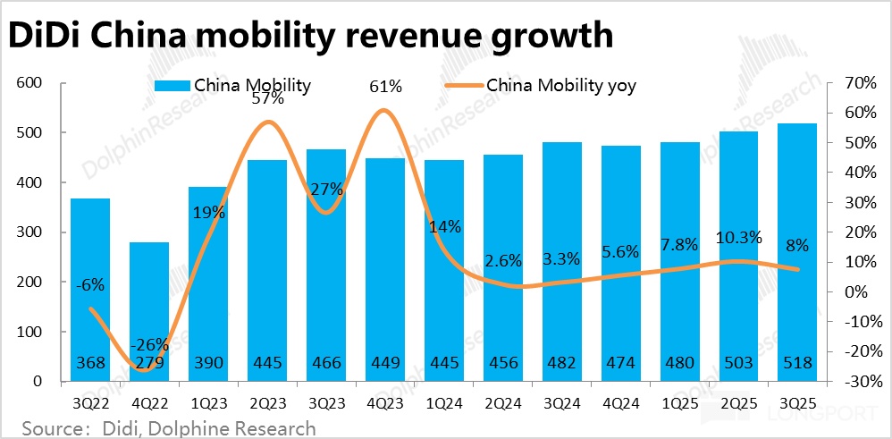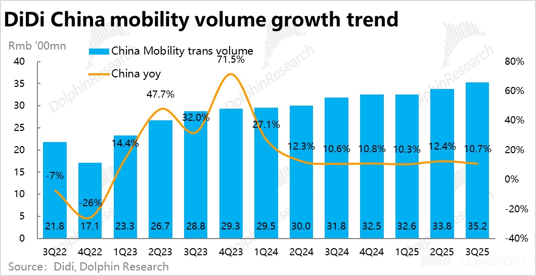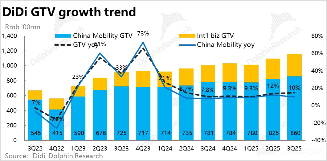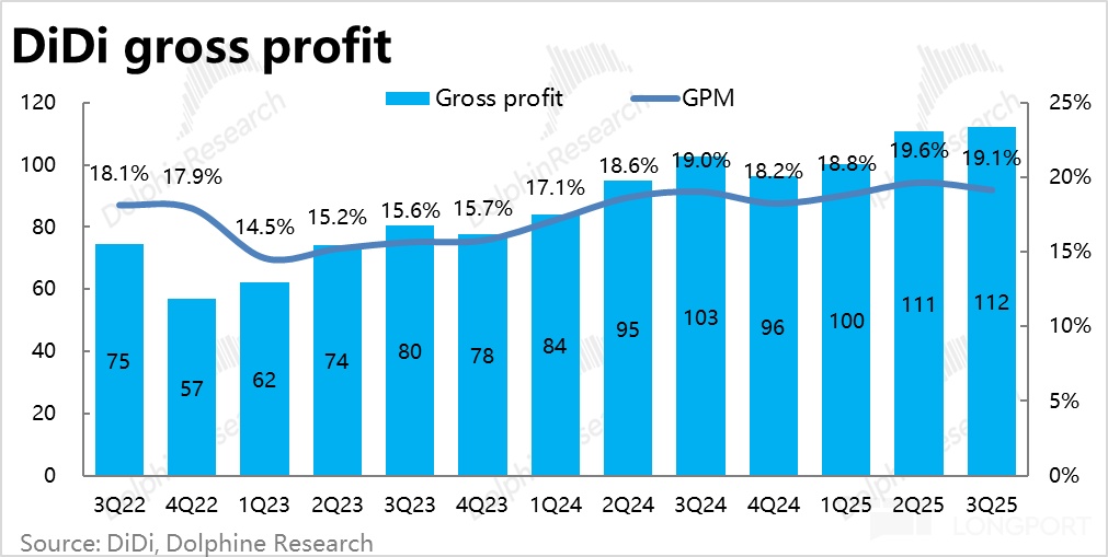 2、海外加速增长:由于滴滴近期重启了在巴西的海外业务(为了抢在 Keeta 入场前夺取先发优势),本季滴滴海外总 GTV 同比增长显著提速到 31%。即便剔除汇率的利好,增速也比上季加速了 1.6pct,反映出在海外投入的增加拉动了业务增长有限的提速,虽然并没有可变汇率口径下的增速看起来那么强劲。