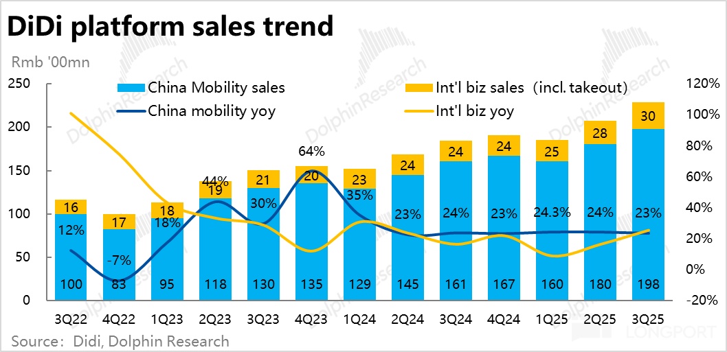 相反的,滴滴国内的平台销售额(反映平台留存的收益)本季同比增长 23.5%,也较上季略有放缓(幅度不足 1pct),依旧大幅跑赢 GTV 和收入增长,且增速差有所扩大。按照 “平台销售额 = GTV – 司机分成/激励 - 税费等” 的计算方式,平台留存的净变现率仍在提升趋势内。