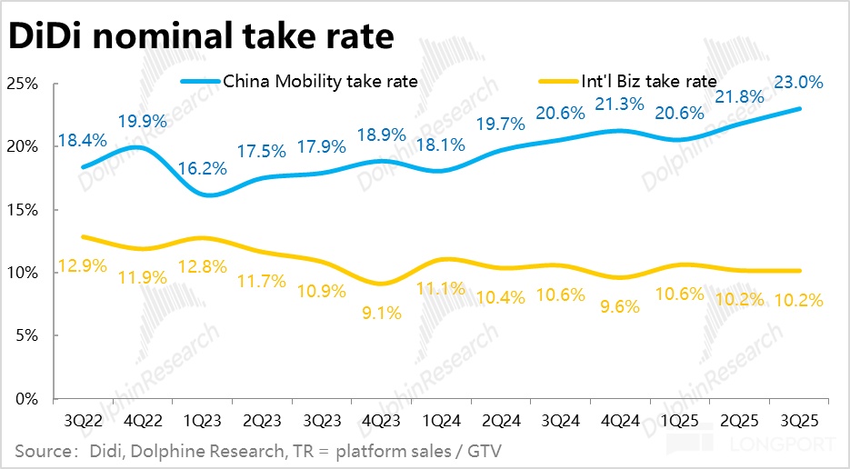 按照公司披露的平台销售额/GTV 的计算出的国内业务平台整体变现率(扣除司机分成,但仍未扣除给消费者的补贴)本季也确实环比走高了 1.2pct