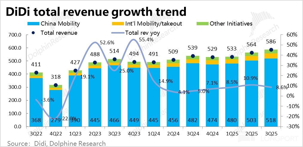 汇总上述各业务加上其他创新业务,滴滴本季总营收约 586 亿,同比增长 8.6%,由于国内营收仍占近 9 成的绝对大头,是跟随国内业务的趋势,增速有所放缓。