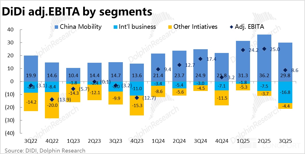 由于国内和海外业务的利润率双双恶化,再加上约 4.4 亿的其他业务亏损,本季度滴滴整体合计 adj.EBITA 为 8.6 亿,同比腰斩。