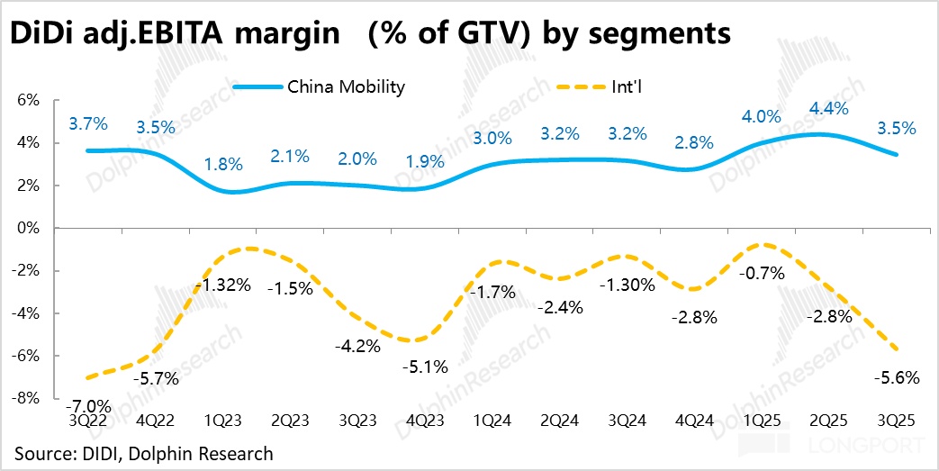 3、国内利润率环比明显收窄:海豚君认为由于国内整体需求的走弱,滴滴对应增加了在国内的补贴和获客投入(主要体现在营销费用的暴涨),滴滴本季国内业务调整后 EBITA 利润为 29.8 亿,较上季度的 36 亿明显走低,利润占 GTV 的比重为 3.5%,同样较上季的 4.4% 明显下滑。但好在并没有在 27~28 亿的指引上给出更差的表现。