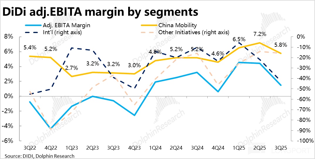不过趋势上,再加上约 4.4 亿的其他业务亏损,本季度滴滴整体合计 adj.EBITA 为 8.6 亿,同比腰斩,抛开预期差肯定还是不好的表现。