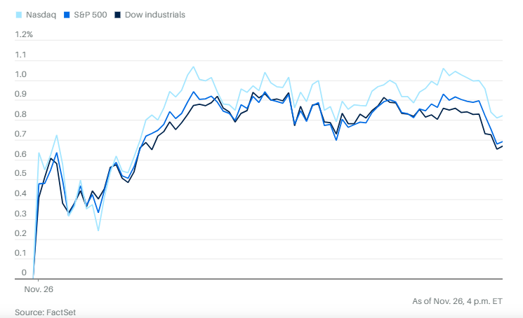 感恩节周的美股“游行”在周三继续前进。道琼斯工业指数上涨315点,涨幅0.7%。标普500指数上涨0.7%。纳斯达克综合指数上涨0.8%。标普500和道琼斯正迎来自2012年以来表现最好的感恩节周,纳斯达克则创下自2008年以来同期最佳表现。