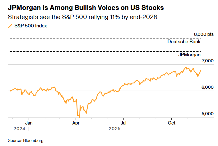 市场上开始出现对2026年美股看涨的押注。德意志银行策略师预计标普500指数将在2026年底升至8000点,意味着将上涨18%,受到强劲盈利和回购上升的支撑。摩根大通的预测为7500点,法国兴业银行则给出了7300点的目标。