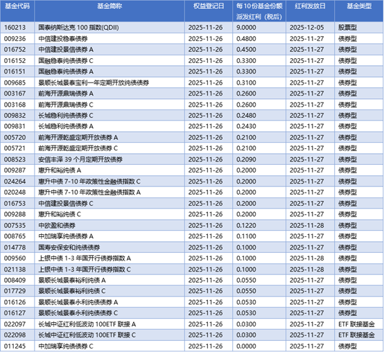 (1)11月26日新发基金共有4只,主要为债券型基金和混合型基金;基金分红30只,多为债券型,派发红利最多的基金是国泰纳斯达克100指数证券投资基金,每10份基金份额派发红利9.0000元;