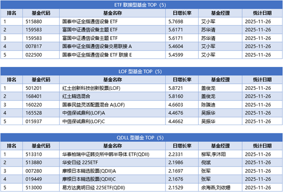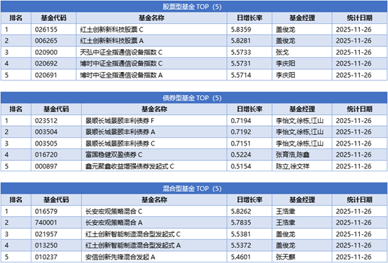 单基金方面,剔除掉 创新封基类型 基金的影响,11月26日业绩表现最好的基金为红土创新科技创新股票(LOF),日增长率为5.8721%,其次为红土创新新科技股票C,日增长率为5.8359%、红土创新新科技股票A,日增长率为5.8281%。