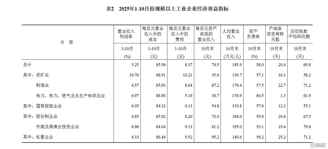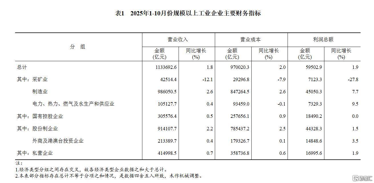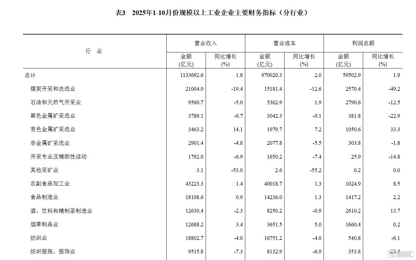 11月27日,国家统计局公布1-10月份全国规模以上工业企业利润。