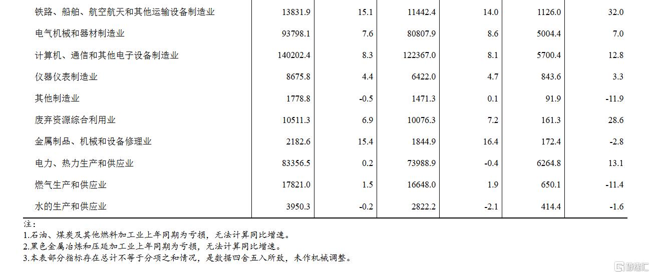 1-10月份,主要行业利润情况如下:有色金属冶炼和压延加工业利润同比增长14.0%,电力、热力生产和供应业增长13.1%,计算机、通信和其他电子设备制造业增长12.8%,农副食品加工业增长8.5%,电气机械和器材制造业增长7.0%,通用设备制造业增长6.2%,专用设备制造业增长5.0%,汽车制造业增长4.4%,非金属矿物制品业增长1.0%,黑色金属冶炼和压延加工业同比由亏转盈,石油、煤炭及其他燃料加工业同比减亏,化学原料和化学制品制造业下降5.4%,纺织业下降6.1%,石油和天然气开采业下降12.5%,煤炭开采和洗选业下降49.2%。