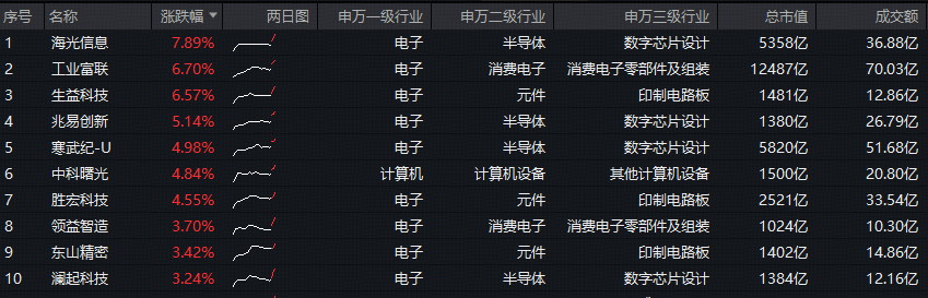 细分方向来看,半导体和消费电子携手走强,半导体方面,海光信息领涨超7%,兆易创新涨逾5%,寒武纪涨近5%;消费电子方面,工业富联涨超6%,领益智造涨逾3%;印制电路板(PCB)亦有亮眼表现,生益科技涨超6%,胜宏科技涨逾4%。