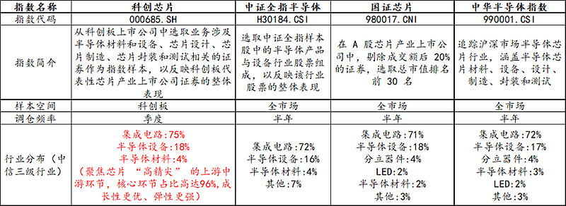 市场上芯片相关指数众多,选取当下热门的科创芯片、半导体等指数进行比较,可以发现,虽然均聚焦为芯片板块,但在指数编制上却大有不同。一句话总结:科创芯片指数聚焦芯片核心环节,“含芯量”更高,弹性强,成长性高。
