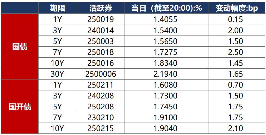 11月26日,尽管股市下跌,但由于债市情绪较弱,加之基金销售新规即将落地的传闻扰动,债市整体承压走弱。截至北京时间20:00,10年期国债活跃券250016收益率上行1.45bp至1.8340%,10年期国开债活跃券250215收益率上行2.10bp至1.9040%。