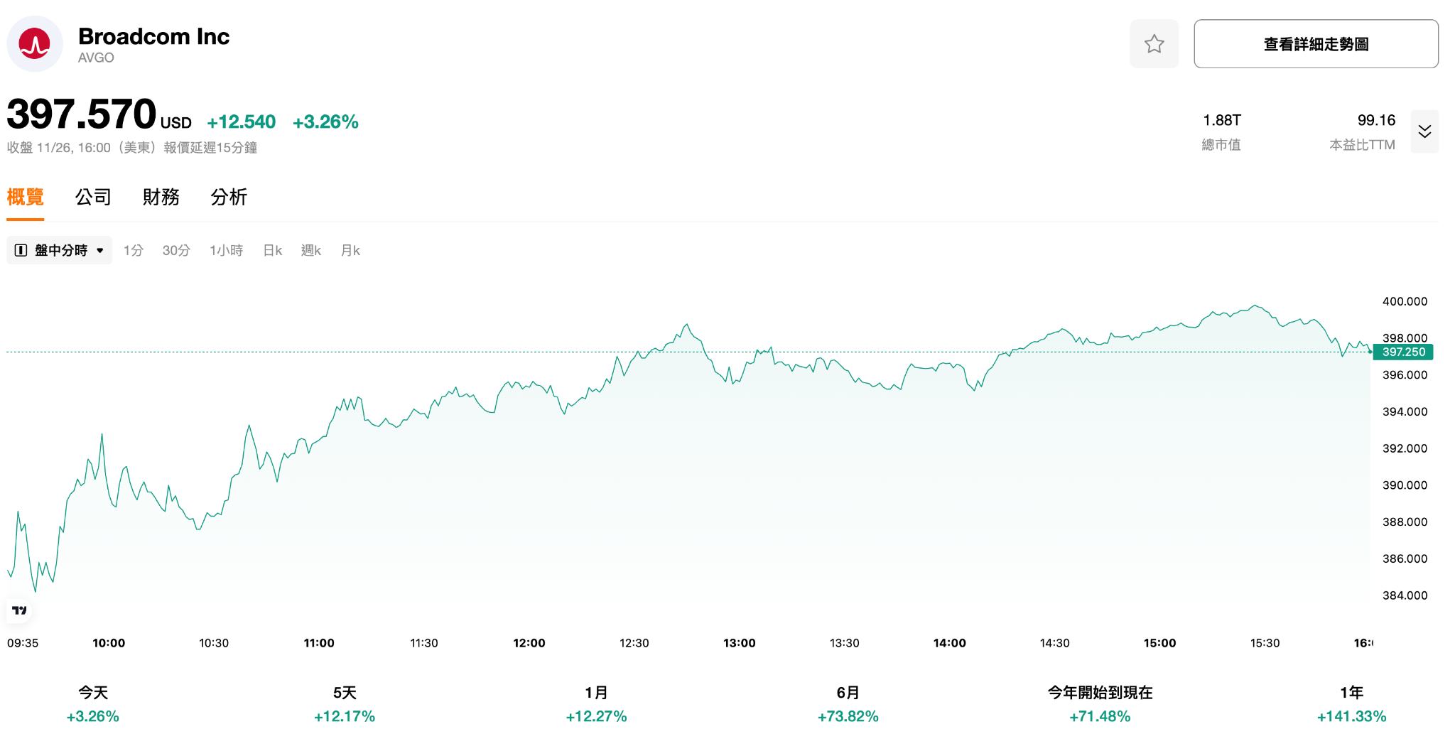 受谷歌链影响,博通收盘大涨3.26%,再次创下新高,市值即将进入两万亿美元梯队。而受零和博弈论影响,英伟达和谷歌涨跌互现,截至收盘,英伟达收涨1.37%,谷歌收跌1.08%。