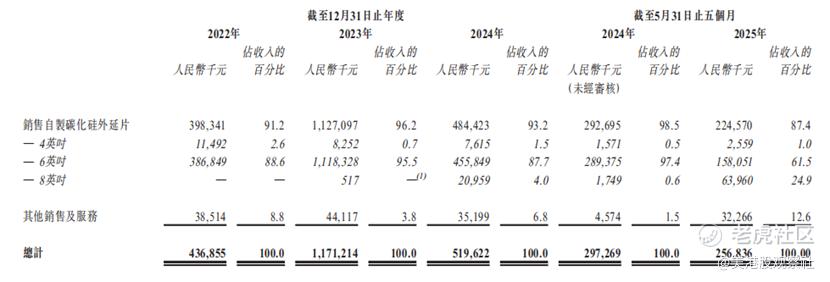 从收入结构来看,公司收入高度聚焦自制碳化硅外延片销售,2022年至2024年及截至2025年5月31日止五个月,自制产品收入分别为3.98亿元、11.27亿元、4.84亿元、2.25亿元,占总营收的91.2%、96.2%、93.2%、87.4%。客户合作模式上,公司以直销为主,针对电动汽车、电力供应等下游行业客户的个性化需求提供定制化产品,核心客户包括新能源汽车领域的头部企业及海外集成器件制造商(IDM),2023年曾与知名海外客户达成汽车级材料战略合作,2024年与海外领先IDM客户就8英寸产品建立合作,优质客户资源为收入稳定性提供了保障。