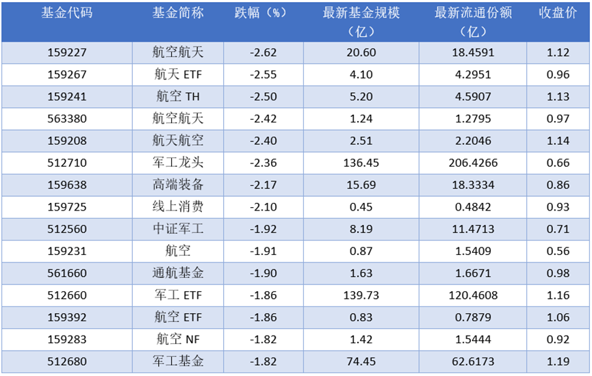 下跌方面,2025年11月26日跌幅最大的是航空航天(159227),跌幅达到2.62%。排名靠前的航天ETF(159267)、航空TH(159241)、航空航天(563380),跌幅分别为2.55%、2.50%、2.42%。