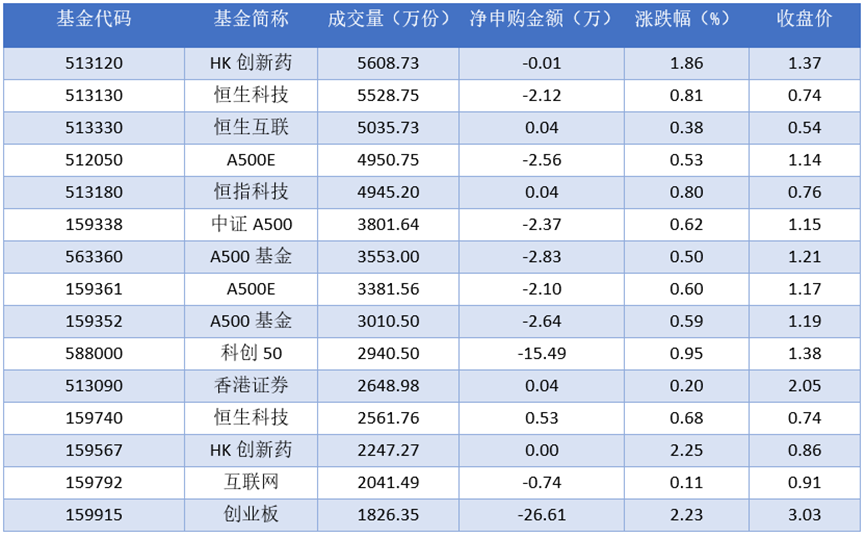从成交量上来看,2025年11月26日成交量最大的是HK创新药(513120),成交量为5608.73万份。排名靠前的恒生科技(513130)、恒生互联(513330)、A500E (512050),成交量分别为5528.75万份、5035.73万份、4950.75万份。