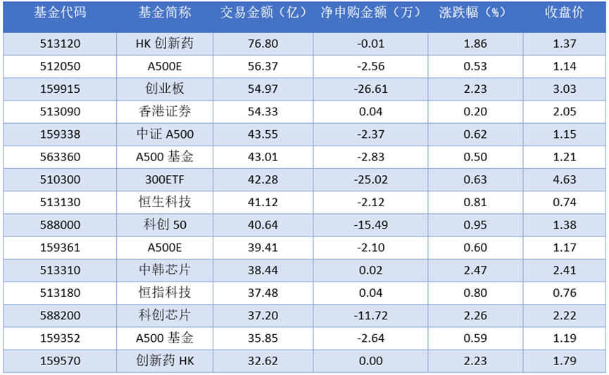 从成交金额上来看,2025年11月26日成交额最大的是HK创新药(513120),交易金额76.80亿元。排名靠前的A500ETF(512050)、创业板(159915)、香港证券(513090),成交额分别为56.37亿元、54.97亿元、54.33亿元。