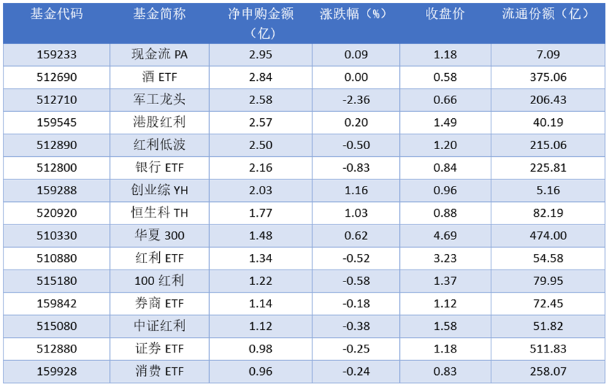细分到资金流动情况上来看,2025年11月26日净申购金额最大的为现金流PA(159233),当日净申购金额为2.95亿元。排名靠前的酒ETF(512690)、军工龙头(512710)、港股红利(159545),申购金额为2.84亿元、2.58亿元、2.57亿元。