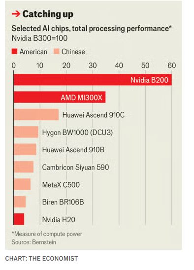中国芯片设计通常牺牲能效来换取性能提升。华为的CloudMatrix系统将384颗昇腾芯片连接起来,性能可以与英伟达最先进的系统匹敌,但耗电量超过四倍。