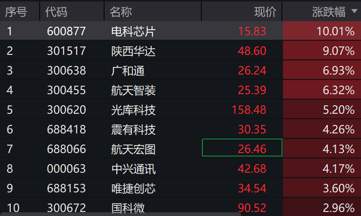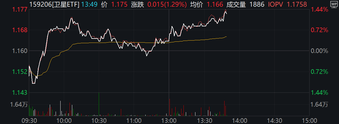 截至13:49,卫星ETF(159206)上涨1.29%。成分股电科芯片(600877)涨停,陕西华达(301517),广和通(300638)等个股跟涨。