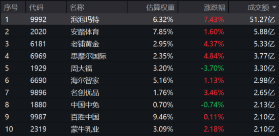 港股通消费50ETF(159268)热门成分股多数飘红,泡泡玛特涨超7%,老铺黄金、思摩尔国际涨超4%,名创优品涨超3%。