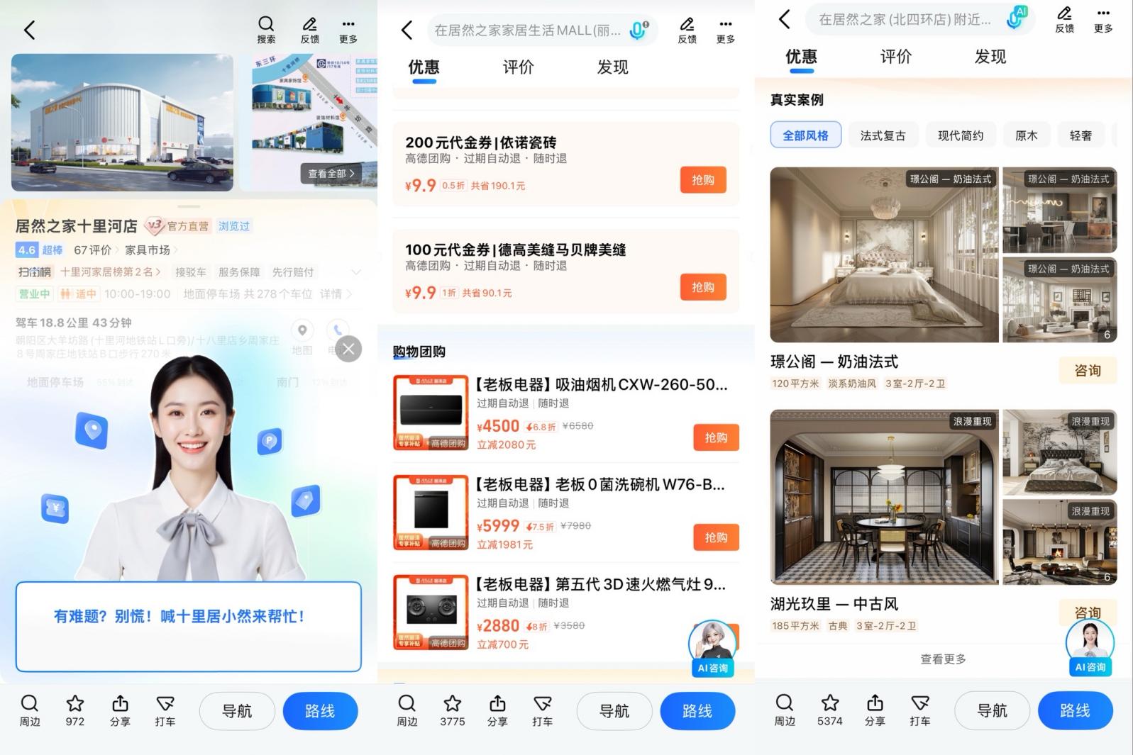 此外,高德面向家居商家开放的AI智能体数字人客服系统已正式上线,支持7×24小时在线解答咨询、智能推荐产品,并联动打车、到店礼等本地生活服务场景,进一步激发用户到店意愿。