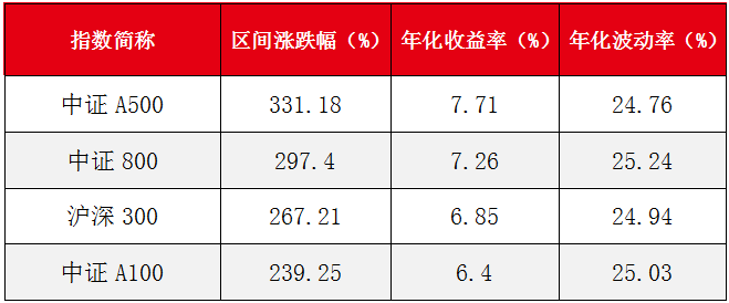 一是历史多阶段长期收益与波动率表现较优。Wind数据显示,中证A500指数自基日(2004年12月31日)以来,累计涨幅达331.18%,年化收益率为7.71%,历史收益率高于中证800、沪深300指数,且历史年化波动率更小。