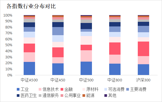 而当前以“新质生产力”为代表的新兴产业正成为经济增长核心引擎,新兴指数行业均衡配置的重要性正愈发凸显。中证A500在工业、信息技术、可选消费、通信服务等行业的占比较高,而在金融、主要消费等传统行业权重较低,体现经济新动能发展方向。具体来看,与传统宽基指数沪深300相比,中证A500在工业、信息技术、通信服务等行业占比较高,聚焦“新质生产力”。